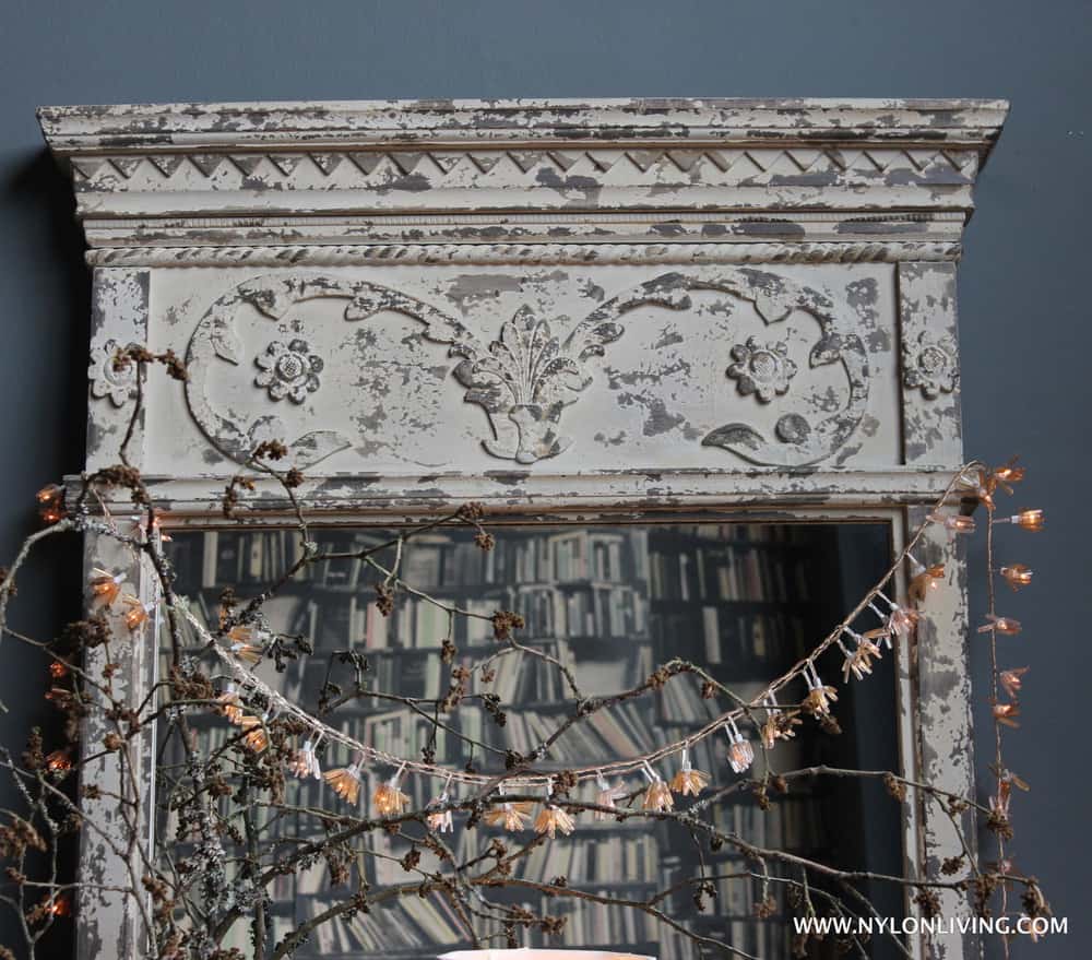 - A mirror should always be reflecting something – in this case the bookshelf wallpaper.