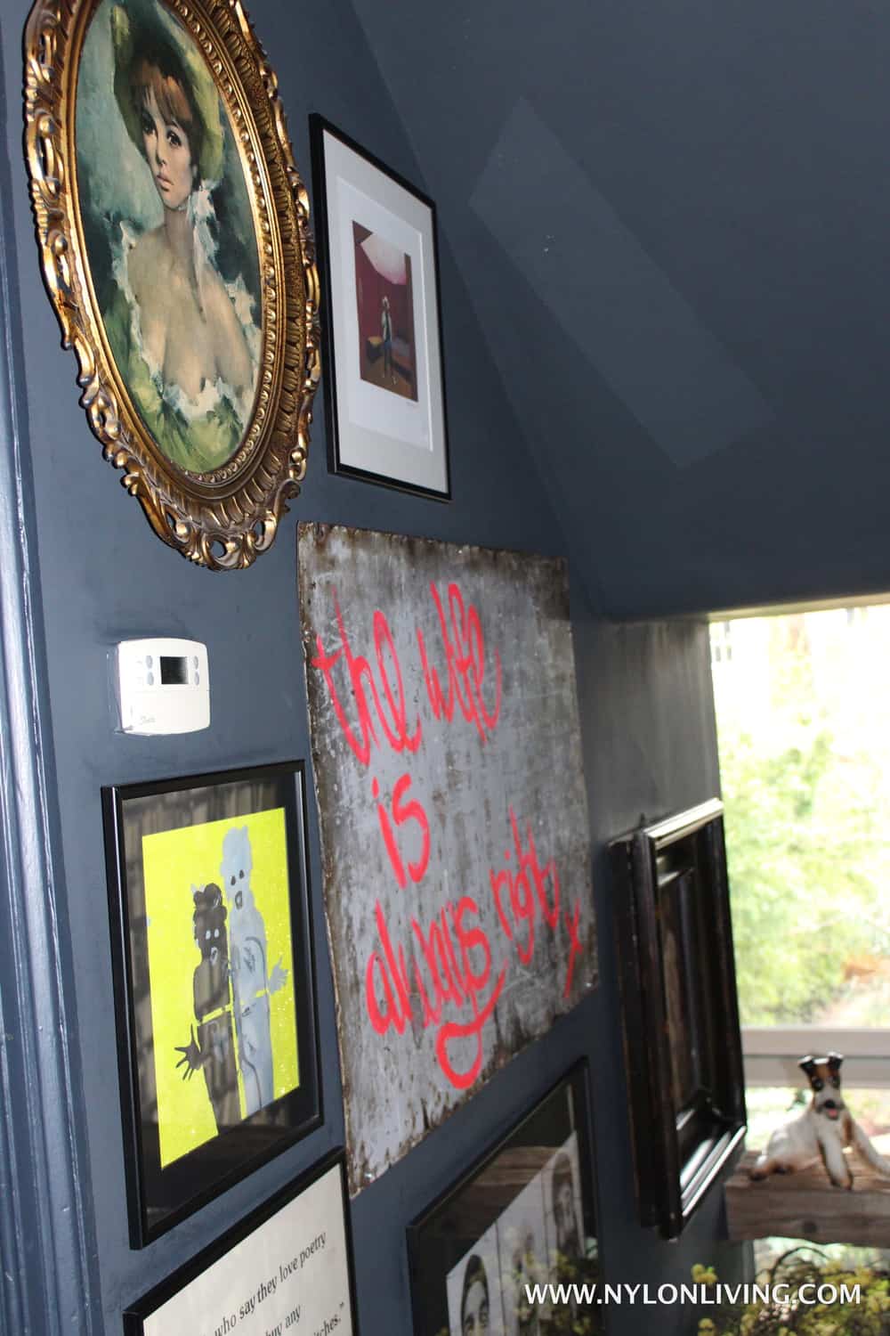 She has a great painting (of dogs found at a flea market) on her wall held up with a nail and a binder clip. Very insouciant chic. I don’t have a photo of it and I SO regret it.