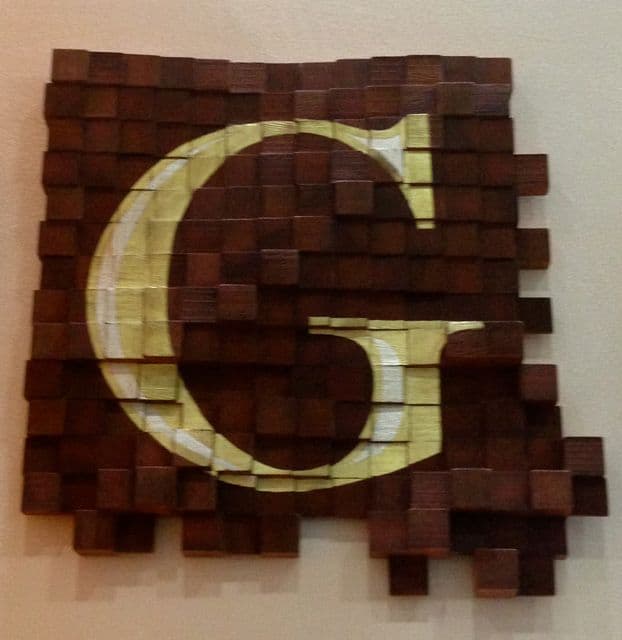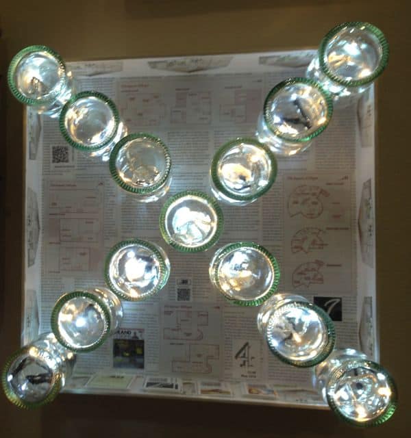 I met Jamie Hubbard who had created artwork his friend’s stand in the Grand Gardens section of show gardens. A cabinet maker, Jamie uses offcuts from his work as well as other materials he recycles into cool one-off art pieces. The X below, for example, are recycled bottles he gets from a cafe near his workplace mounted onto wood with LED lights. His pieces are one-offs and he works to commission as well.