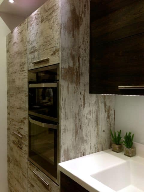Another kitchen I thought was cool had a weathered wood finish. The look adds texture and rustic charm in a modern setting and without the splinters.