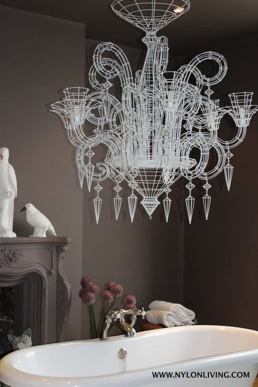 - An oversized chandelier in the bathroom is an unexpected touch.