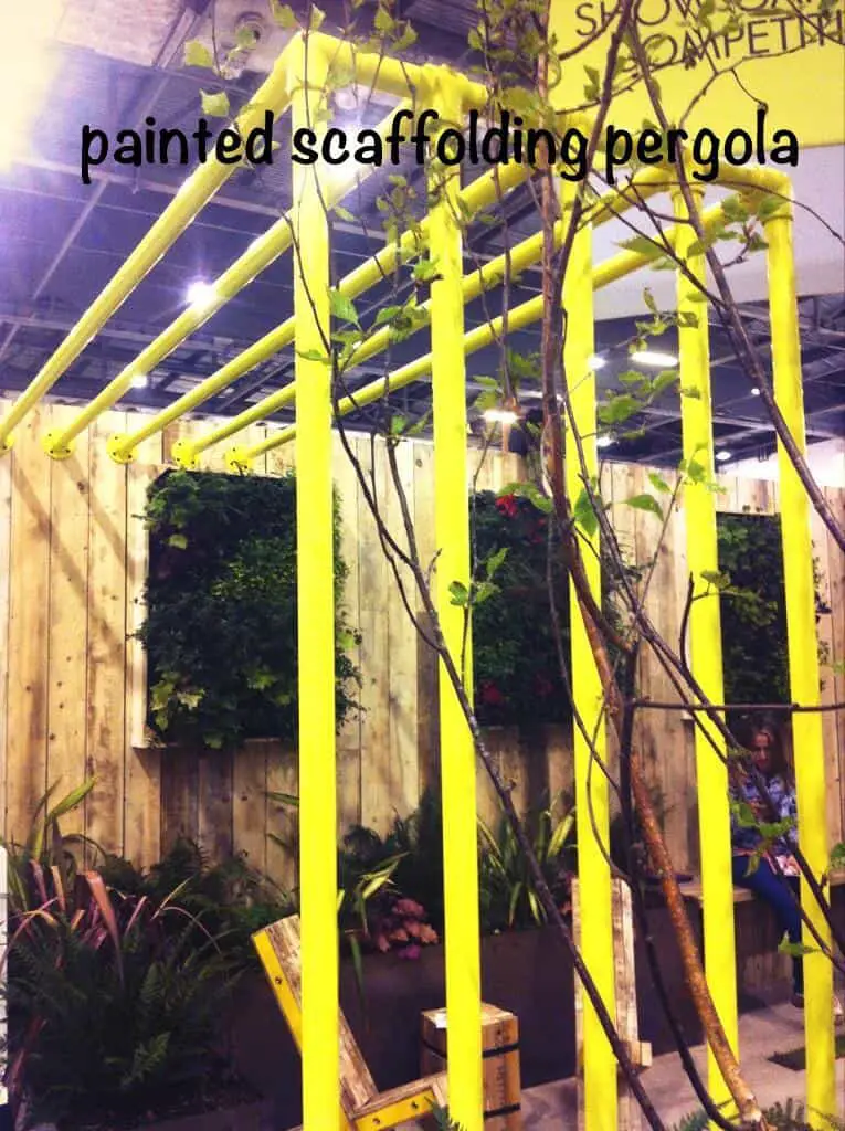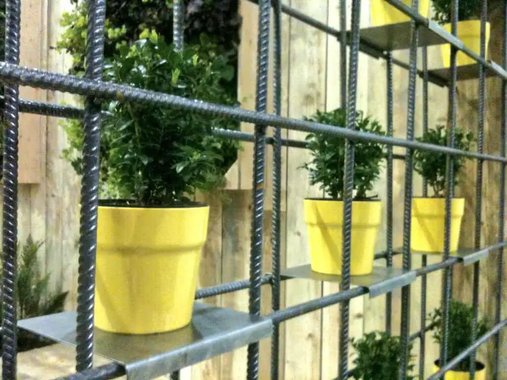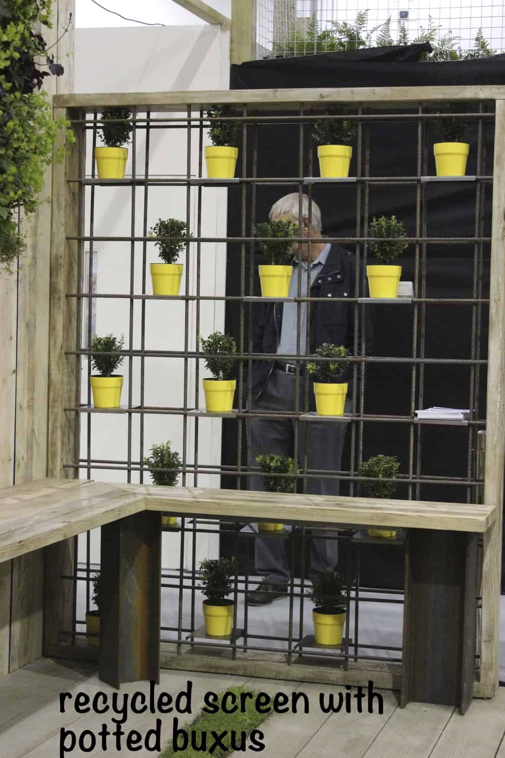 The green pergola is actually painted scaffolding. Framed vertical planters provide a living green wall. The feature wall is a grid made from recycled re-bar, steel and recycled floor joists and filled with potted Buxus. Sedum strips in the decking add interest and planting to the floor space.
