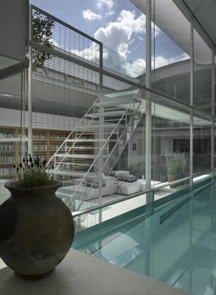 There are also retractable fabric shades covering the glass roof preventing the space from becoming too sunny. The living area is open plan and bright leading out to the patio garden. Note the inset bookshelves which provide a streamlined book. The whole look is clean and minimal but warm through the judicious use of wood throughout. Speaking of warm, the white contemporary shelf in front of the pool is actually a fireplace.